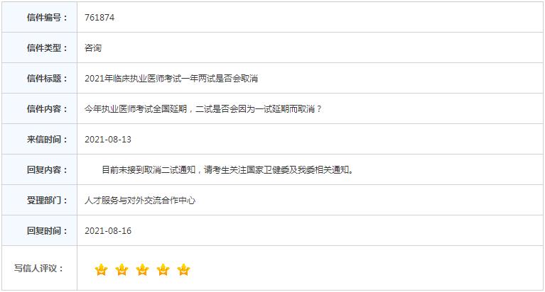福建考區(qū)2021年臨床助理醫(yī)師筆試考試一年兩試是否會(huì)取消?近期有考生在福建衛(wèi)健委主任信箱提出了相關(guān)問題,官方答復(fù)如下: