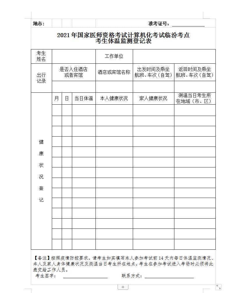 臨汾考點2021年臨床執(zhí)業(yè)助理醫(yī)師考試二試考生體溫監(jiān)測登記表