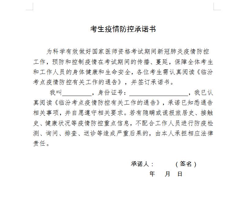 2021年臨汾考點(diǎn)臨床助理醫(yī)師醫(yī)學(xué)綜合考試二試《考生疫情防控承諾書》