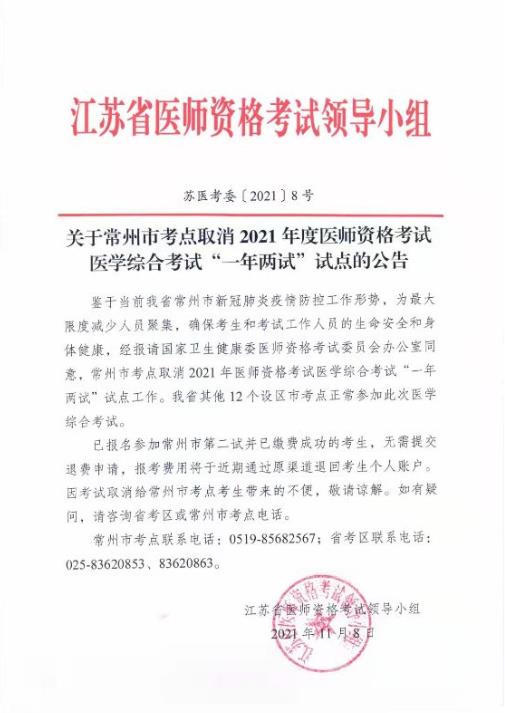 關于常州市考點取消2021年度醫(yī)師資格考試