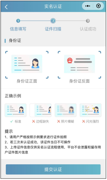 選擇身份證后需要進(jìn)行證件掃描,請用戶嚴(yán)格按照示例進(jìn)行操作,如果掃描次數(shù)過多我們會提示進(jìn)行人工審核流程