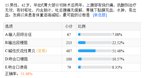 【答案解析】 本病例為畢Ⅱ式胃大部切除術(shù)后發(fā)生的并發(fā)癥。表現(xiàn)的特點(diǎn)是上腹燒灼痛、嘔吐膽汁和體重減輕的堿性反流性胃炎。其原因是手術(shù)后膽汁、胰液可進(jìn)入殘胃,膽鹽、磷脂酸膽堿破壞胃黏膜屏障,H+逆向轉(zhuǎn)移,促使組胺釋放引起黏膜充血、水腫、糜爛和出血等改變,引發(fā)了上述癥狀。其他選項(xiàng)的并發(fā)癥表現(xiàn)特點(diǎn)與本病例不相符。