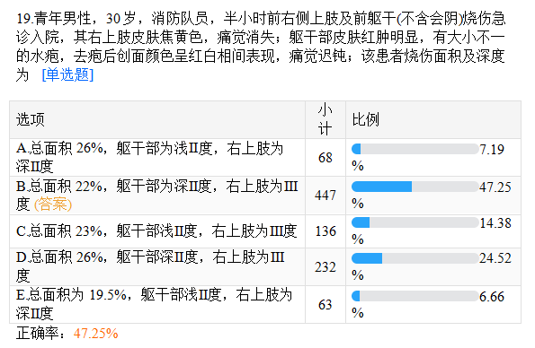 【答案解析】 患者右側(cè)和前軀干燒傷,單側(cè)上臂面積為3.5%,前臂為3%,手為2.5%;前軀干為13%,故總面積應(yīng)為22%;深Ⅱ度特點(diǎn)是:有水皰,去皰皮后創(chuàng)面微濕,紅白相間,痛覺遲鈍;而淺Ⅱ度痛覺明顯;Ⅲ度燒傷創(chuàng)面無(wú)水皰,呈蠟白或焦黃色,甚至碳化,痛覺消失,故該患者軀干部為深Ⅱ度,右上肢為Ⅲ度。