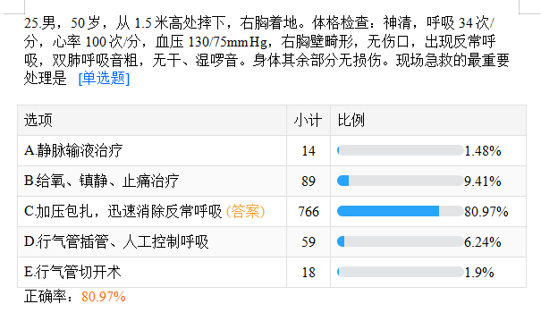 【答案解析】 患者老年男性,高墜傷,右胸著地,神清,呼吸偏快,心率、血壓尚穩(wěn),右側(cè)連枷胸,雙肺無(wú)明顯損傷。首先考慮診斷多根多處肋骨骨折。連枷胸會(huì)出現(xiàn)縱隔撲動(dòng),致缺氧、二氧化碳潴留,循環(huán)衰竭,故應(yīng)積極處理。原則為鎮(zhèn)痛、清理呼吸道分泌物、固定胸廓、防治并發(fā)癥。作為現(xiàn)場(chǎng)急救,最重要處理是加壓包扎,迅速消除反常呼吸。故選C。