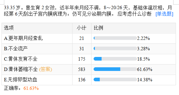 35歲。曾生育2女孩,近半年來月經(jīng)不調(diào),8~20/26天,基礎(chǔ)體溫雙相,月經(jīng)第6天刮出子宮內(nèi)膜病理為:仍可見分泌期內(nèi)膜。