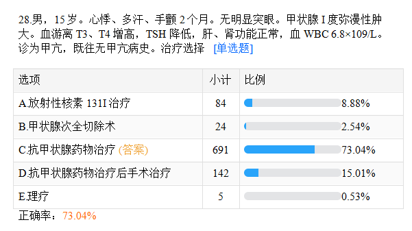 男,15歲。心悸、多汗、手顫2個月。無明顯突眼。甲狀腺I度彌漫性腫大。血游離T3、T4增高,TSH降低,肝、腎功能正常,血WBC 6.8×109/L。診為甲亢,既往無甲亢病史。治療選擇