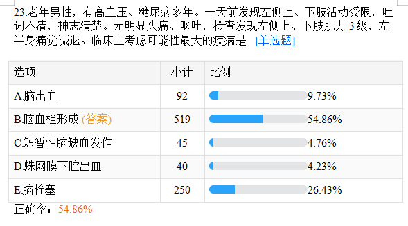 【答案解析】 腦出血時往往伴有頭痛、嘔吐,故排除A;短暫性腦缺血發(fā)作往往癥狀很快恢復正常,故排除C;蛛網(wǎng)膜下腔出血往往起病急,突然出現(xiàn)頭痛、嘔吐等,故排除D;患者平常無房顫等心臟疾病,故腦栓塞可能性不大,排除E;患者年齡較大,糖尿病多年,為腦血栓形成的危險因素,無明顯頭痛、嘔吐,為典型的腦血栓,故選B。