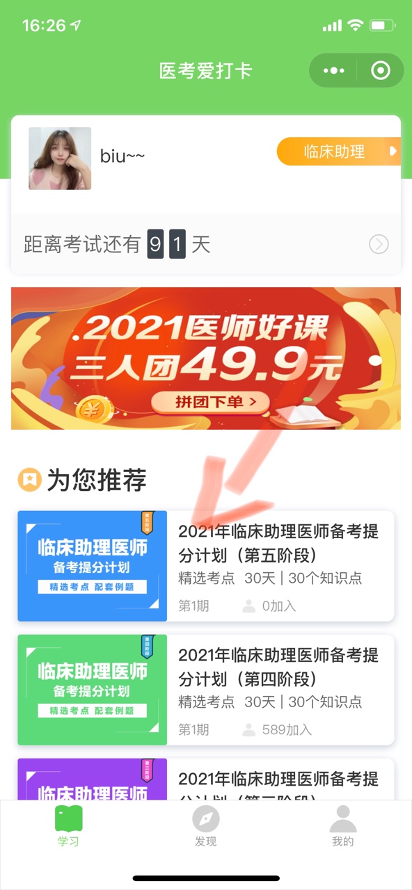 第三步:選擇備考科目后即進入學習計劃選擇的頁面,請選擇“您的備考計劃”,如臨床助理醫(yī)師備考**計劃(第五階段),然后點擊下方“加入計劃 開始學習”按鈕,開始正式進入打卡學習。