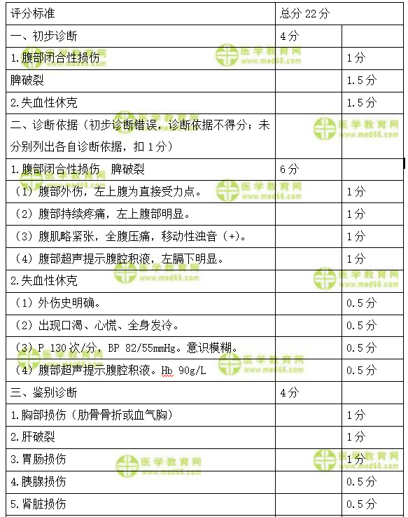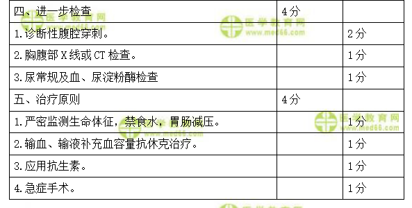 查體:T 37.0℃,P 130次/分,R 25次/分,BP 82/55mmHg。意識(shí)模糊,醫(yī)學(xué)|教育網(wǎng)淺表淋巴結(jié)未觸及腫大。雙側(cè)瞳孔等大等圓,直徑約3mm,對(duì)光反射靈敏。瞼結(jié)膜蒼白,鞏膜無(wú)黃染,口唇蒼白,胸廓擠壓征陰性。雙肺未聞及干濕性啰音。心界不大,心率130次/分,律齊,心尖部未聞及病理性雜音。腹略膨隆,未見(jiàn)腸型及蠕動(dòng)波,未見(jiàn)腹壁淺靜脈曲張。腹肌略緊張,全腹有壓痛,左上腹明顯,有反跳痛,肝脾肋下均未初級(jí),Murphy征(-),雙腎區(qū)無(wú)叩痛,移動(dòng)性濁音(+),聽(tīng)診腸鳴音2次/分。脊柱、骨盆、四肢未發(fā)現(xiàn)異常。