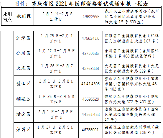 重慶考區(qū)2021年醫(yī)師資格考試現(xiàn)場審核一欄表