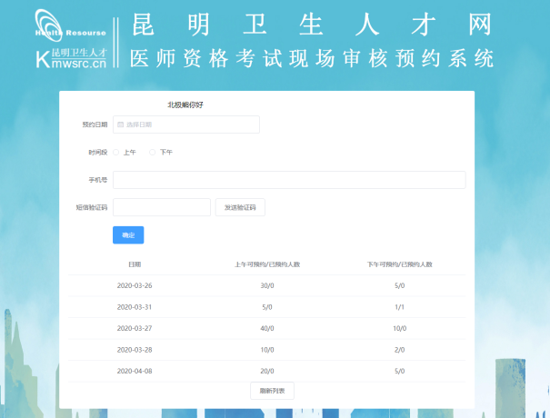 昆明考點定于2020年4月6日10時開放昆明衛(wèi)生人才網(wǎng)醫(yī)師資格考試現(xiàn)場審核預約系統(tǒng)。