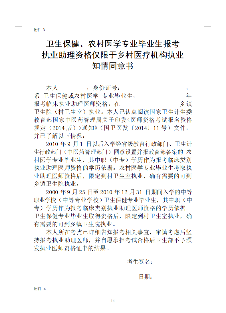 本人_______________,身份證號(hào):______________________, 系衛(wèi)生保健或農(nóng)村醫(yī)學(xué)專業(yè)畢業(yè)生,_____________年報(bào)考臨床執(zhí)業(yè)助理醫(yī)師資格,在__________鄉(xiāng)鎮(zhèn)衛(wèi)生院(村衛(wèi)生室)執(zhí)業(yè)。本人已認(rèn)真閱讀國(guó)家衛(wèi)生計(jì)生委教育部國(guó)家中醫(yī)藥管理局關(guān)于印發(fā)<醫(yī)師資格考試報(bào)名資格 規(guī)定(2014版)>通知》(國(guó)衛(wèi)醫(yī)發(fā)〔2014〕11號(hào))文件, 并已了解以下情況: