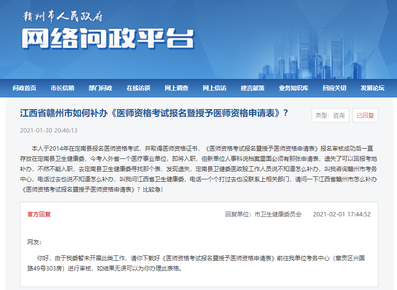 本人于2014年在定南縣報(bào)名醫(yī)師資格考試,并取得醫(yī)師資格證書,《醫(yī)師資格考試報(bào)名暨授予醫(yī)師資格申請(qǐng)表》報(bào)名審核成功后一直存放在定南縣衛(wèi)生健康委,今考入外省一個(gè)醫(yī)療事業(yè)單位,即將入職,但新單位人事科說(shuō)檔案里面必須有那張申請(qǐng)表,遺失了可以回報(bào)考地補(bǔ)辦,不然不能入職,去定南縣衛(wèi)生健康委尋找那個(gè)表,發(fā)現(xiàn)遺失,定南縣衛(wèi)健委醫(yī)政股工作人員說(shuō)不知道怎么補(bǔ)辦,叫我咨詢贛州市考務(wù)中心,電話過(guò)去也說(shuō)不知道怎么補(bǔ)辦,叫我問(wèn)江西省衛(wèi)生健康委,電話一個(gè)個(gè)打過(guò)去也沒(méi)聯(lián)系上相關(guān)部門,請(qǐng)問(wèn)一下江西省贛州市怎么補(bǔ)辦《醫(yī)師資格考試報(bào)名暨授予醫(yī)師資格申請(qǐng)表》?