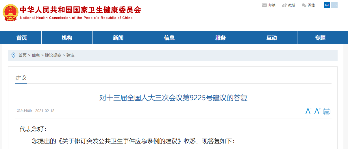 《關(guān)于修訂突發(fā)公共衛(wèi)生事件應(yīng)急條例的建議》國家衛(wèi)健委做出回復(fù)!