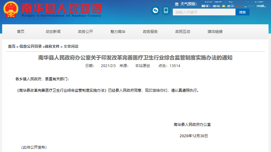 南華縣人民政府辦公室關(guān)于印發(fā)改革完善醫(yī)療衛(wèi)生行業(yè)綜合監(jiān)管制度實(shí)施辦法的通知