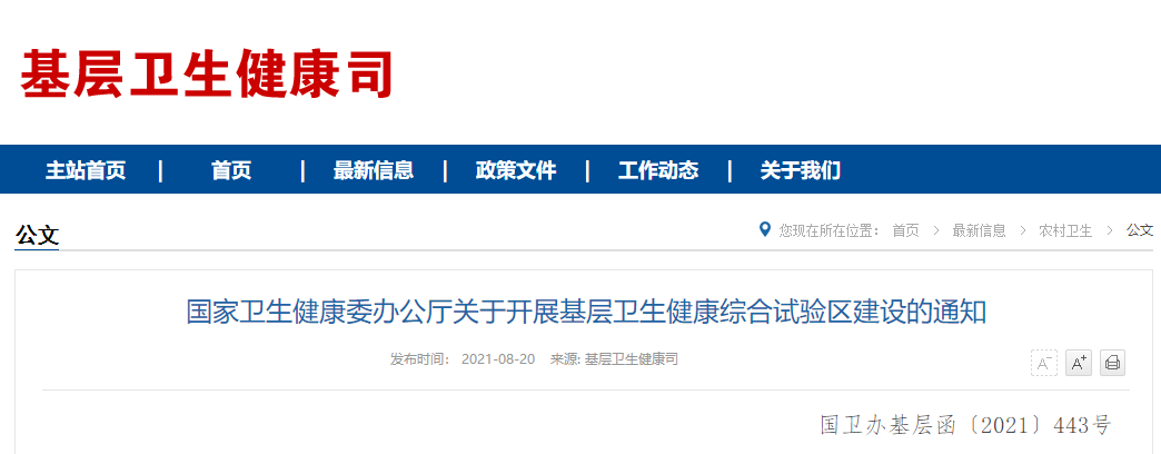 國家衛(wèi)生健康委辦公廳關于開展基層衛(wèi)生健康綜合試驗區(qū)建設的通知
