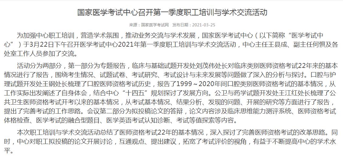 為加強(qiáng)中心職工培訓(xùn),營(yíng)造學(xué)術(shù)氛圍,推動(dòng)業(yè)務(wù)交流與學(xué)術(shù)發(fā)展,國(guó)家醫(yī)學(xué)考試中心(以下簡(jiǎn)稱“醫(yī)學(xué)考試中心”)于3月22日下午召開醫(yī)學(xué)考試中心2021年第一季度職工培訓(xùn)與學(xué)術(shù)交流活動(dòng),中心主任王縣成、副主任何懼及各處室工作人員參加了交流。