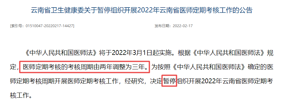 云南省衛(wèi)生健康委關(guān)于暫停組織開展2022年云南省醫(yī)師定期考核工作的公告