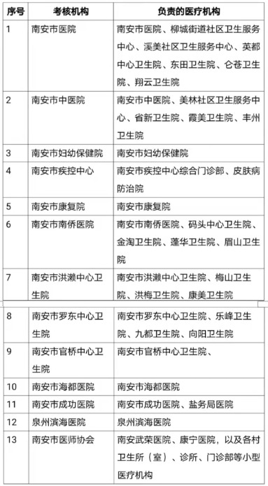 根據(jù)《福建省衛(wèi)生健康委員會(huì)關(guān)于做好2019-2021年度醫(yī)師定期考核工作的通知》(閩衛(wèi)醫(yī)政函〔2021〕694號(hào))要求,現(xiàn)將2019-2021年度醫(yī)師定期考核南安市考核機(jī)構(gòu)名單公布如下: