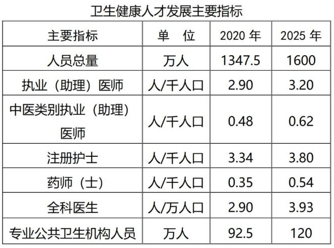 《規(guī)劃》指出,“十四五”期間,我國(guó)衛(wèi)生健康人才發(fā)展的總體目標(biāo)是:促進(jìn)人才服務(wù)能力提高與結(jié)構(gòu)優(yōu)化,完善人才管理制度機(jī)制,營(yíng)造人才發(fā)展的良好環(huán)境。明確到2025年,衛(wèi)生健康人員總量達(dá)到1600萬(wàn)人,每千人口執(zhí)業(yè)(助理)醫(yī)師數(shù)達(dá)到3.20人、每千人口注冊(cè)護(hù)士數(shù)達(dá)到3.80人、每千人口藥師(士)數(shù)達(dá)到0.54人,每萬(wàn)人口全科醫(yī)生數(shù)達(dá)到3.93人,專業(yè)公共衛(wèi)生機(jī)構(gòu)人員數(shù)增長(zhǎng)到120萬(wàn)人。提高衛(wèi)生健康人才專業(yè)技術(shù)水平和服務(wù)能力,執(zhí)業(yè)助理醫(yī)師占醫(yī)師的比例降低到15%以下,基層醫(yī)療衛(wèi)生機(jī)構(gòu)中衛(wèi)生技術(shù)人員占到75%以上。
