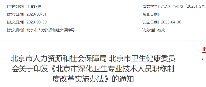 關于印發(fā)《北京市深化衛(wèi)生專業(yè)技術人員職稱制度改革實施辦法》的通知