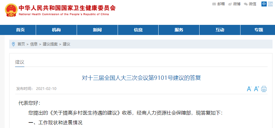 國家衛(wèi)健委發(fā)布“對十三屆全國人大三次會議《關(guān)于提高鄉(xiāng)村醫(yī)生待遇的建議》的答復(fù)”,為方便大家了解,在此醫(yī)學(xué)教育網(wǎng)小編整理如下: