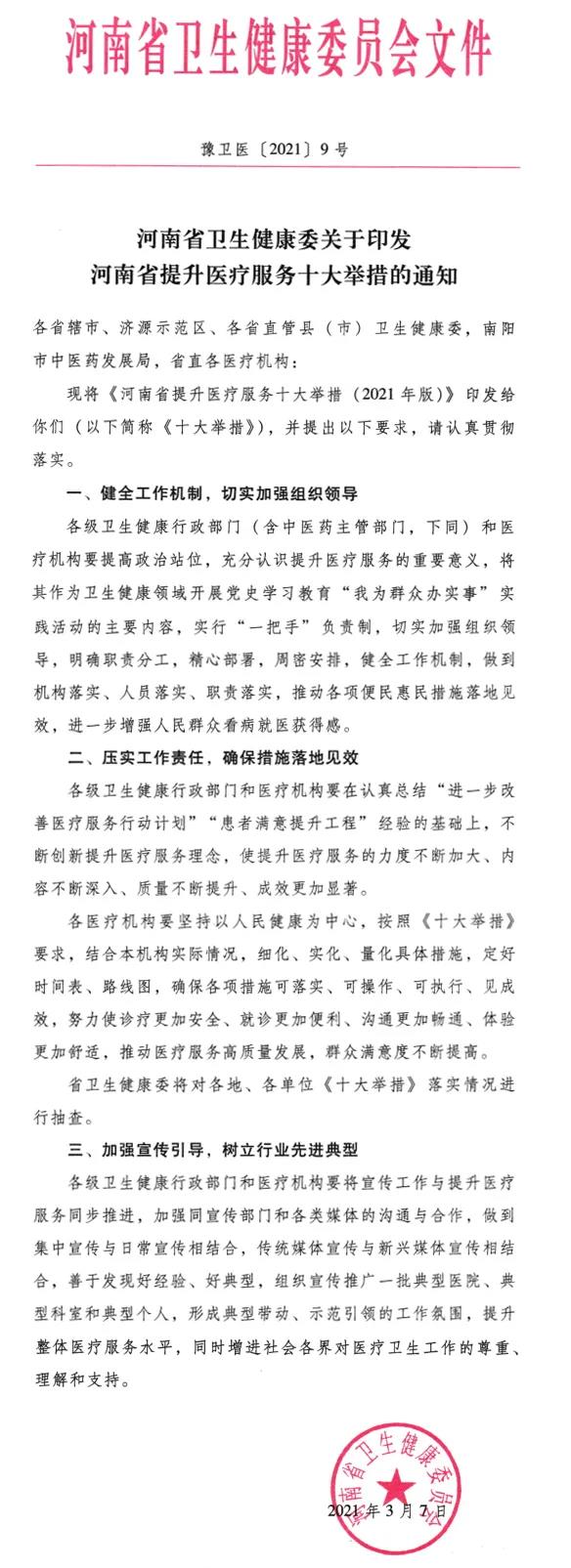 為深入推進醫(yī)療衛(wèi)生事業(yè)高質量發(fā)展,保障醫(yī)療安全,為群眾提供更高效優(yōu)質的醫(yī)療服務,河南省衛(wèi)生健康委結合實際情況,制定《河南省提升醫(yī)療服務十大舉措( 2021 年版)》,要求各級衛(wèi)生健康行政部門和醫(yī)療機構認真貫徹落實,將其作為衛(wèi)生健康領域開展黨史學習教育“我為群眾辦實事”實踐活動的主要內容,定好時間表、路線圖,推動各項便民惠民措施落地見效,努力使診療更加安全、就診更加便利、溝通更加暢通、體驗更加舒適,進一步增強人民群眾看病就醫(yī)獲得感,為中原更加出彩筑牢健康保障。