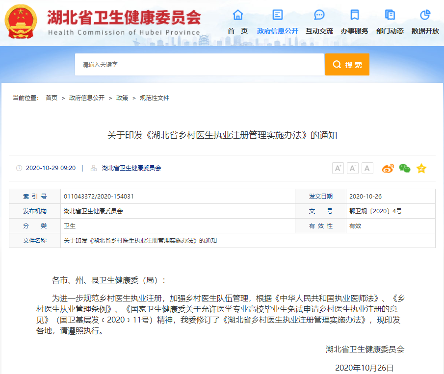 湖北省衛(wèi)健委發(fā)布《湖北省鄉(xiāng)村醫(yī)生執(zhí)業(yè)注冊管理實(shí)施辦法》修訂情況。