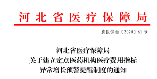 為進一步加強定點醫(yī)藥機構(gòu)醫(yī)療費用監(jiān)管,河北省醫(yī)療保障局《關(guān)于建立定點醫(yī)藥機構(gòu)醫(yī)療費用指標異常增長預(yù)警提醒制度的通知》。
