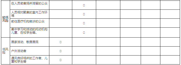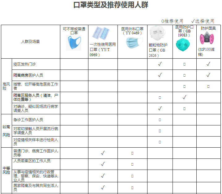 在新型冠狀病毒感染的肺炎流行期間,建議選擇合適的口罩類型,不過度防護(hù)。按防疫工作性質(zhì)和風(fēng)險等級提出以下指引: