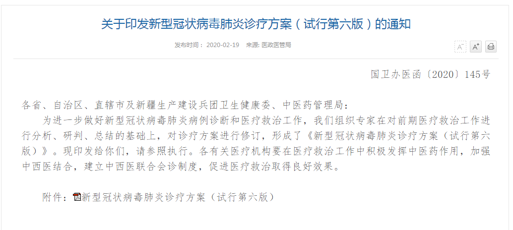 2020年2月19日,國家衛(wèi)生健康委員會發(fā)布了《新型冠狀病毒肺炎診療方案(試行第六版)》。相比于此前的版本,新版的《診療方案》中增加了新冠病毒的傳播途徑“存在經(jīng)氣溶膠傳播的可能”;取消湖北省和湖北省以外其他省份的區(qū)別,統(tǒng)一分為“疑似病例”和“確診病例”兩類。
