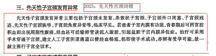 2025年:②副中腎管衍化物發(fā)育不全所致異常,包括無(wú)子宮、無(wú)陰道、痕跡子宮、子宮發(fā)育不良、單角子宮、始基子宮、輸卵管發(fā)育異常;③副中腎管衍化物融合障礙所致異常,包括雙子宮、雙角子宮、鞍狀子宮和縱隔子宮等。