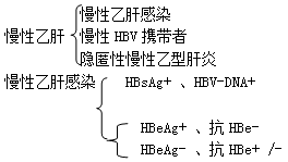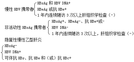 注:另約20%隱匿性慢性乙型肝炎患者除HBV DNA陽(yáng)性外,其余HBV血清學(xué)標(biāo)志均為陰性。診斷需排除其他病毒及非病毒因素引起的肝損傷。