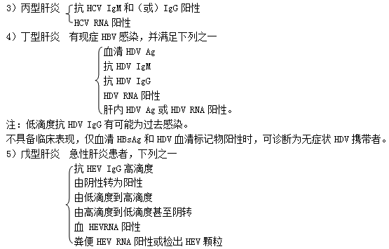 (1)甲型肝炎:抗HAV IgM陽(yáng)性;糞便中檢出HAV顆粒或抗原或HAV RNA。