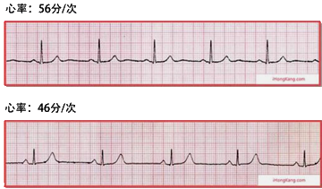 符合竇性心律的特征,頻率低于60次/分,一般在40~59次/分,常伴有竇性心律不齊(即不同PP間期的差異大于0.12秒)。