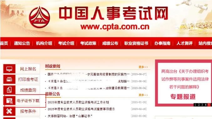 步驟1:訪問中國人事考試網(wǎng)首頁,點擊左側(cè)菜單中的【電子證書下載】。
