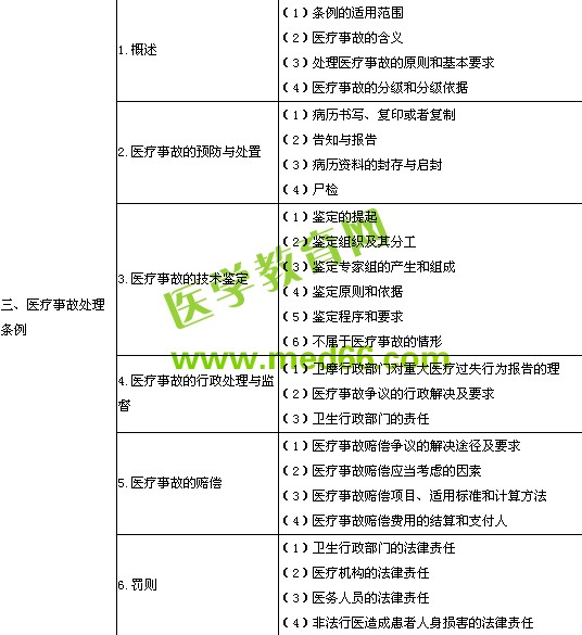 | 4.考核和培訓(xùn) | (1)醫(yī)師考核內(nèi)容 (2)醫(yī)師考核不合格的處理 (3)表彰與獎(jiǎng)勵(lì) | |