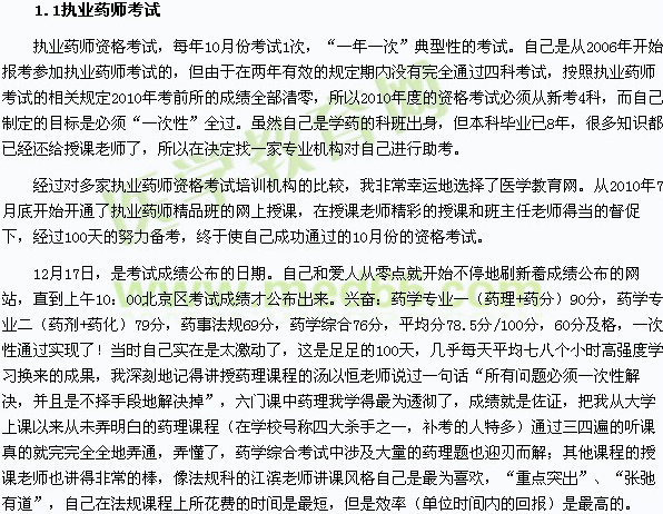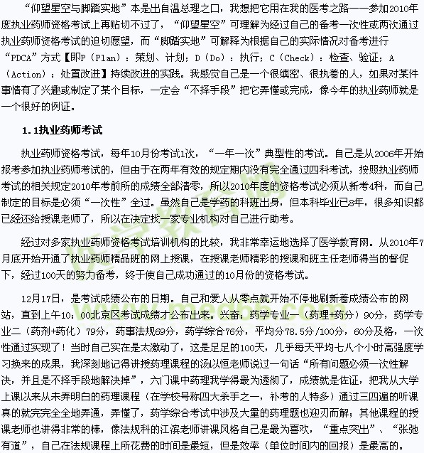 編者按:2010年執(zhí)業(yè)藥師學(xué)員wlka***根據(jù)自己執(zhí)業(yè)藥師考試的經(jīng)驗(yàn),在醫(yī)學(xué)教育網(wǎng)“我的醫(yī)考之路”大型征文活動(dòng)中寫(xiě)下《我的醫(yī)考之路——仰望星空與腳踏實(shí)地》一文,與廣大奮斗在2011年執(zhí)業(yè)藥師考試第一線的朋友們分享,幫助更多考生通過(guò)考試!