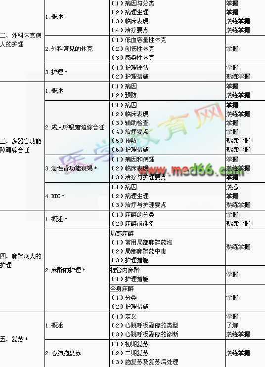 | 2.手術室護理工作 | (1)物品準備和無菌處理 (2)病人的準備 (3)手術中的無菌原則 | 熟練掌握 熟練掌握 掌握 | |
