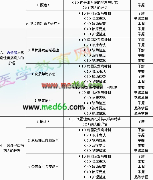 | 10.原發(fā)性支氣管肺癌 | (1)病因及發(fā)病機(jī)制 (2)臨床表現(xiàn)(分類) (3)輔助檢查 (4)治療要點(diǎn) (5)護(hù)理措施 | 掌握 掌握 了解 了解 熟練掌握 | |