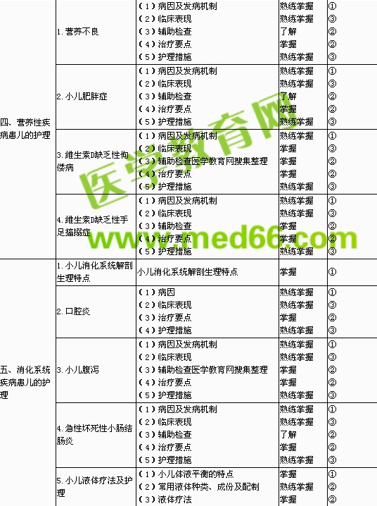 | 4.小兒的營養(yǎng)與喂養(yǎng) | (1)小兒能量與營養(yǎng)素的需要 (2)嬰兒喂養(yǎng) (3)兒童少年膳食安排 | 了解 熟練掌握 了解 | ① ③ ① | |