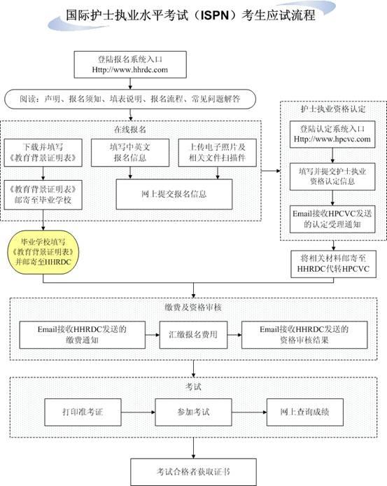 衛(wèi)生部人才交流服務(wù)中心(HHRDC)與美國(guó)國(guó)外護(hù)校畢業(yè)生國(guó)際委員會(huì)(CGFNS)合作開(kāi)展國(guó)際護(hù)士執(zhí)業(yè)水平(ISPN)考試項(xiàng)目,此后國(guó)際醫(yī)學(xué)教.育網(wǎng)搜集整理護(hù)士執(zhí)業(yè)水平考試應(yīng)試流程將便捷很多,具體如下:
