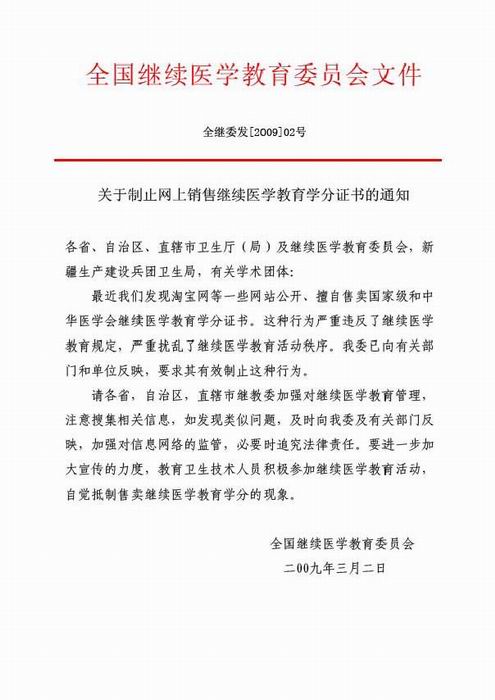 關(guān)于制止網(wǎng)上銷售繼續(xù)醫(yī)學(xué)教育學(xué)分證書的通知