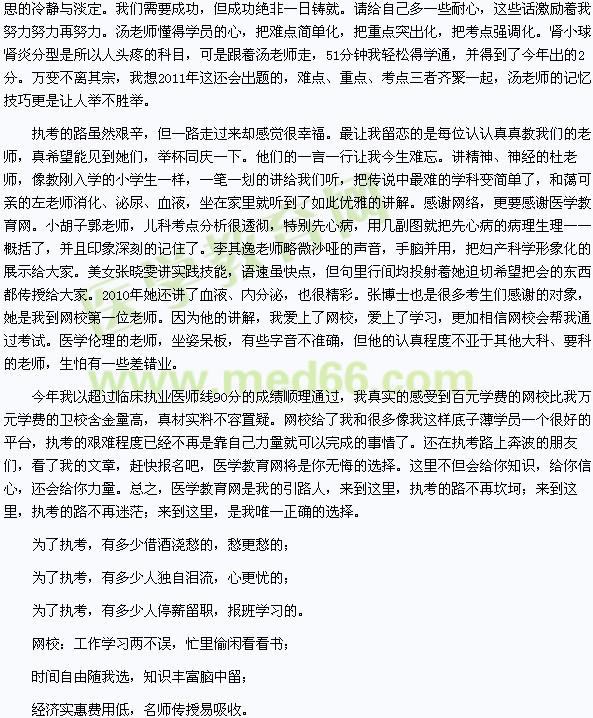 編者按:臨床執(zhí)業(yè)醫(yī)師學(xué)員根據(jù)自己2010年臨床執(zhí)業(yè)醫(yī)師考試的經(jīng)驗(yàn),在醫(yī)學(xué)教育網(wǎng)“我的醫(yī)考之路”大型征文活動中寫下了《我的醫(yī)考之路——從零開始也可一次通過》一文,與廣大奮斗在2011年醫(yī)學(xué)考試第一線的朋友們分享,幫助更多考生通過考試!