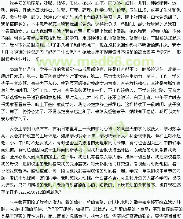 我的醫(yī)考之路戰(zhàn)線拉的比較長——三年。因?yàn)槲沂菑牧汩_始,2000年衛(wèi)校畢業(yè),一直在鄉(xiāng)鎮(zhèn)衛(wèi)生院工作,2003、2004年考兩年執(zhí)助。為了確保執(zhí)業(yè)一次通過,2008年我偶爾看一些西安交大醫(yī)學(xué)院的網(wǎng)上授課視頻。覺得這樣的授課方式很好。2009年初我在網(wǎng)上看到了醫(yī)學(xué)教育網(wǎng),我突然感到我的救星出現(xiàn)了。這樣的學(xué)習(xí)方式太適合我這個(gè)從零開始的學(xué)生。