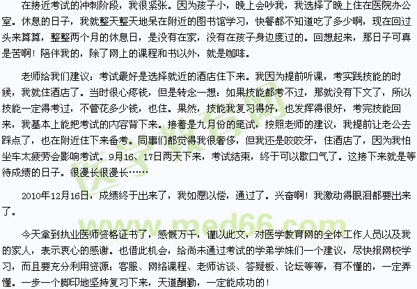 編者按:臨床執(zhí)業(yè)醫(yī)師學員根據(jù)自己2010年臨床執(zhí)業(yè)醫(yī)師考試的經(jīng)驗,在醫(yī)學教育網(wǎng)“我的醫(yī)考之路”大型征文活動中寫下了《我的醫(yī)考之路——因為有你而精彩!》一文,希望可以幫助奮斗在2011年臨床執(zhí)業(yè)醫(yī)師考生!
