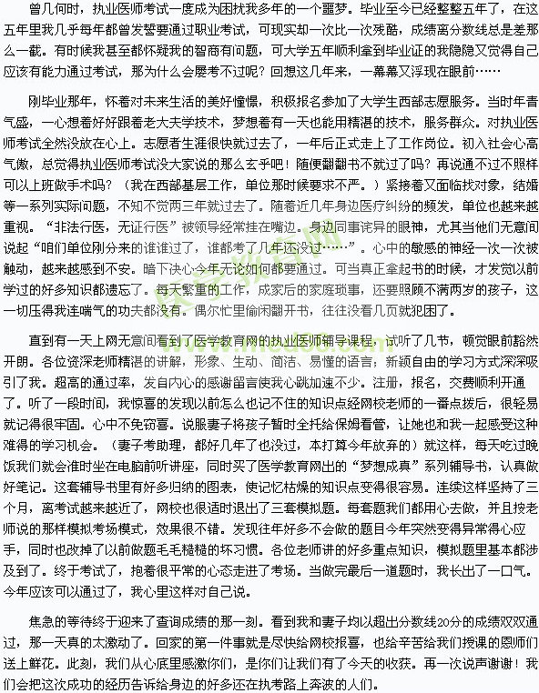 編者按:醫(yī)學(xué)教育網(wǎng)“我的醫(yī)考之路”大型征文活動中很多的學(xué)員踴躍參加,臨床執(zhí)業(yè)醫(yī)師學(xué)員根據(jù)自己2010年的醫(yī)師考試經(jīng)歷,記錄下:我的醫(yī)考之路——獻給奔波的人們: