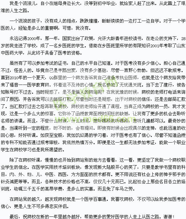 編者按:醫(yī)學教育網“我的醫(yī)考之路”大型征文活動中很多的學員踴躍參加,中西醫(yī)結合執(zhí)業(yè)醫(yī)師學員根據(jù)自己2010年的醫(yī)師考試經歷,記錄下:我的醫(yī)考之路——職業(yè)學生:
