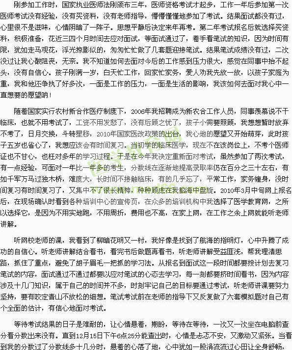 編者按:醫(yī)學(xué)教育網(wǎng)“我的醫(yī)考之路”大型征文活動中很多的學(xué)員踴躍參加,臨床執(zhí)業(yè)醫(yī)師學(xué)員根據(jù)自己2010年的醫(yī)師考試經(jīng)歷,記錄下:我的醫(yī)考之路——設(shè)定目標(biāo)努力堅持就成功:
