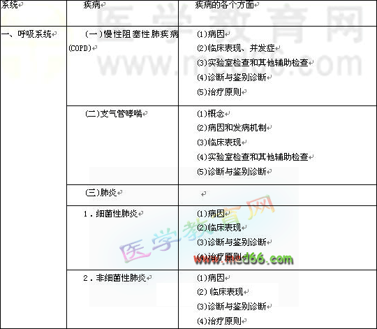 | 2.咳嗽與咳痰 | (1)常見病因 (2)臨床表現(xiàn) (3)伴隨癥狀及臨床意義 |